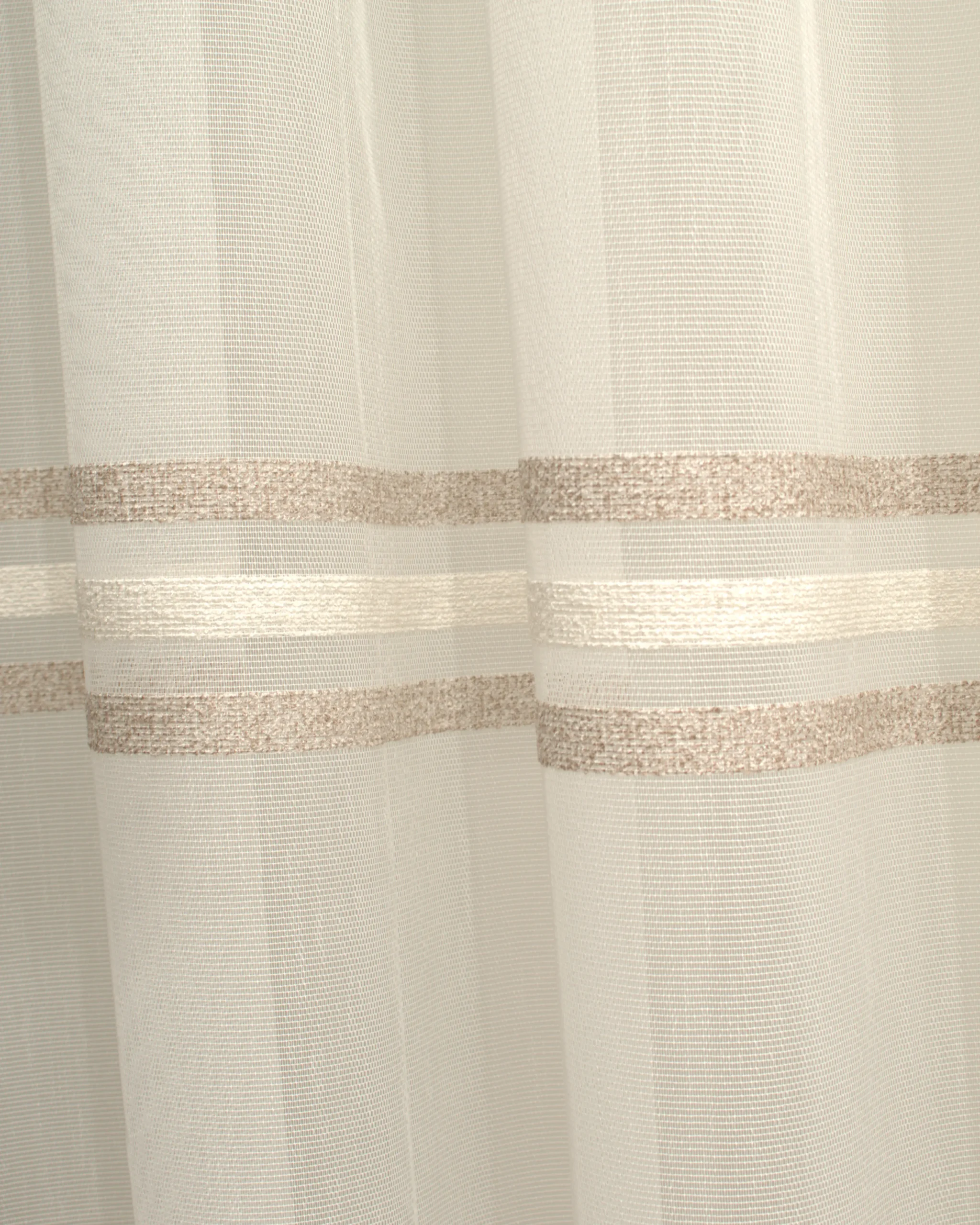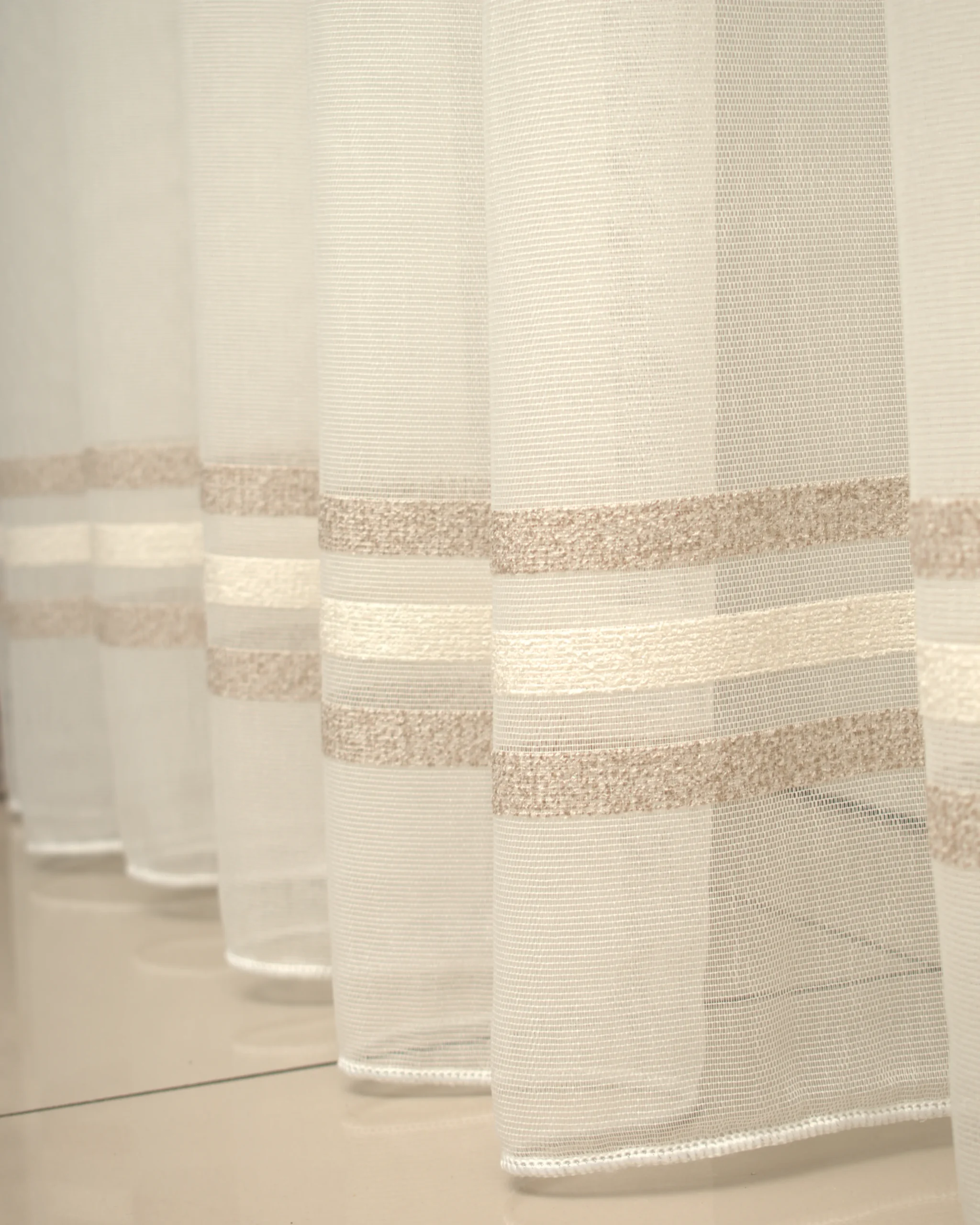 Diskretne kapućino horizontalne pruge daju ovoj zavesi poseban vizuelni akcenat i sofisticiran izgled, bez narušavanja jednostavnosti prostora. Neutralna kombinacija bele i sive boje čini je idealnim izborom za dnevne sobe, spavaće sobe, trpezarije i poslovne prostore.