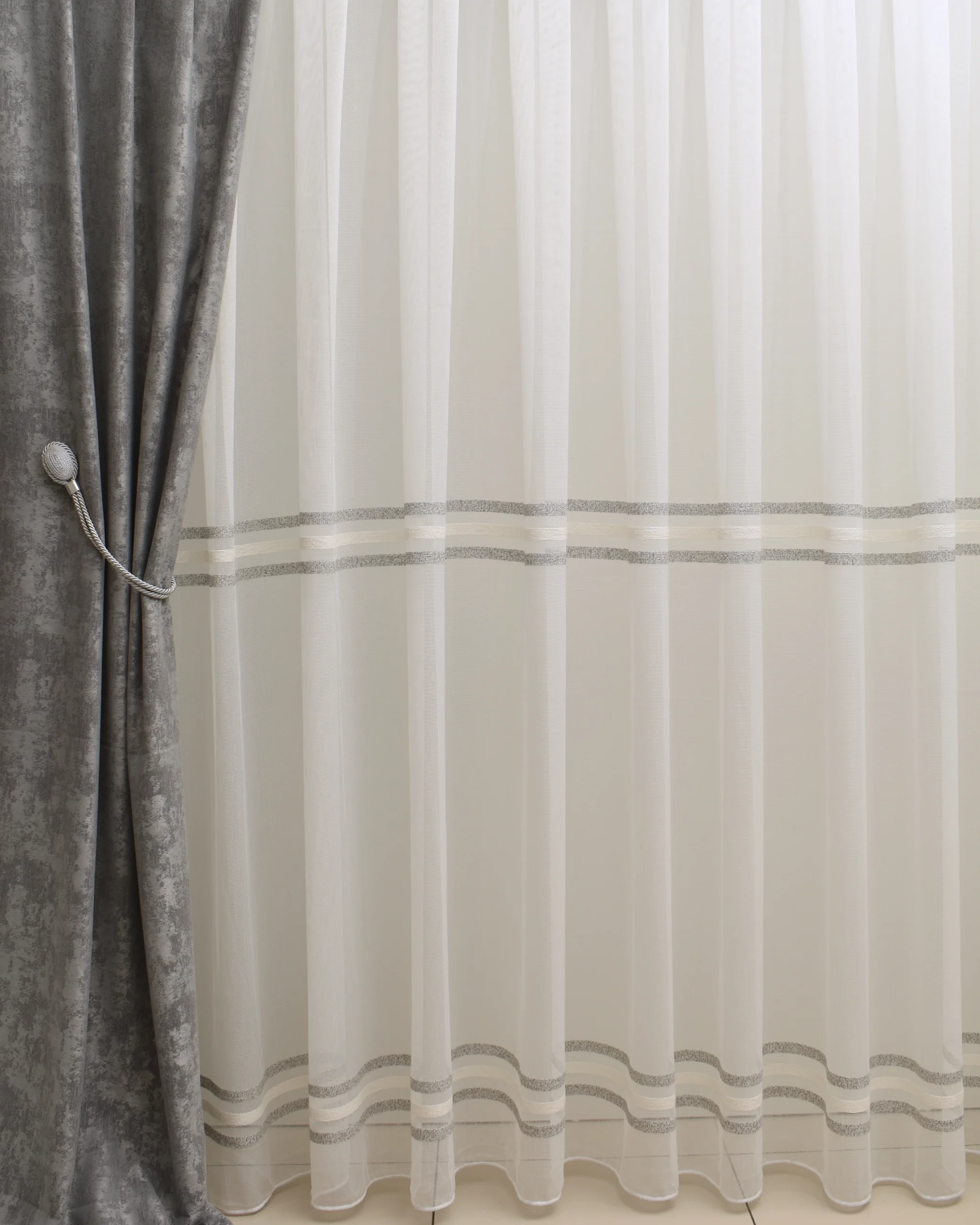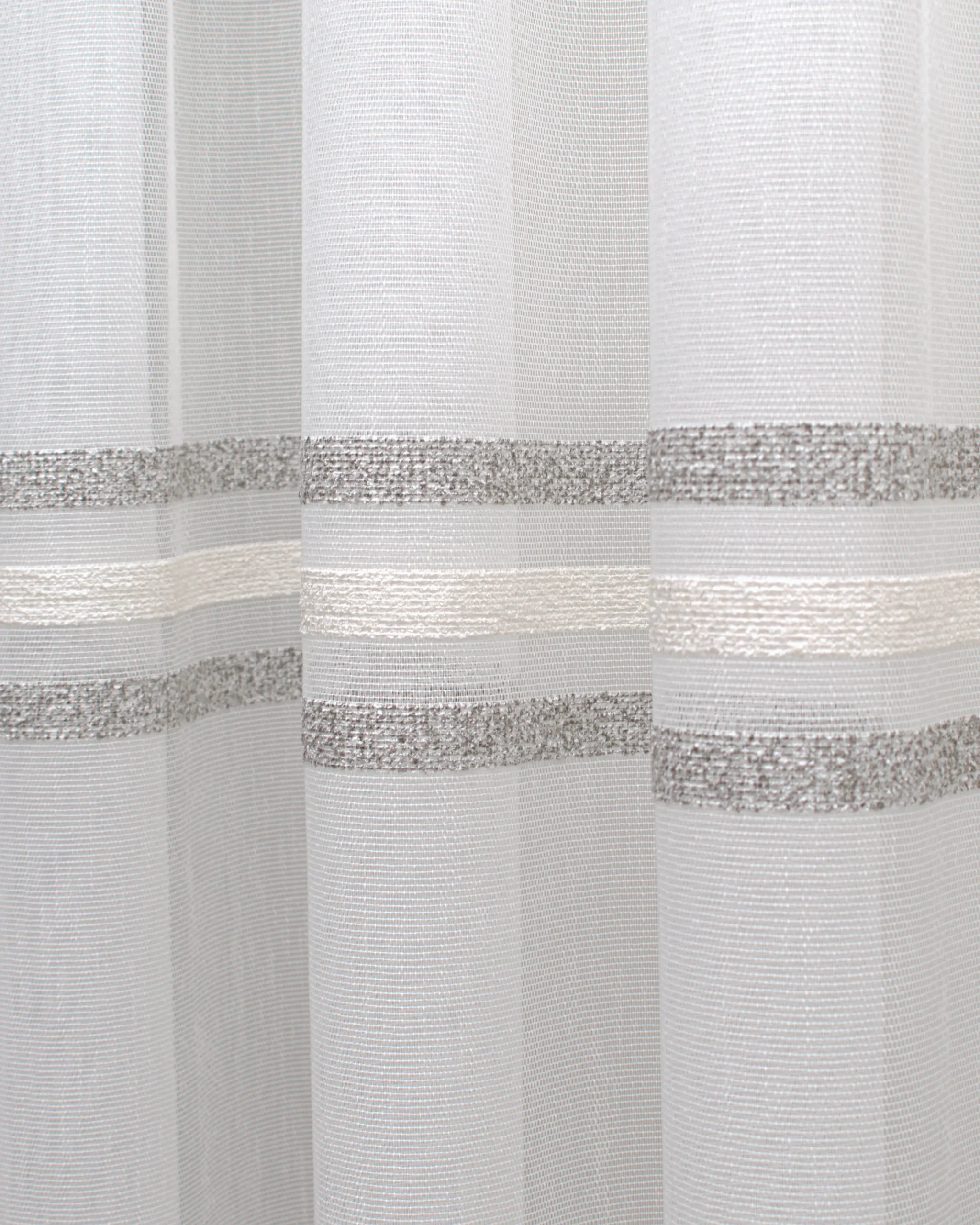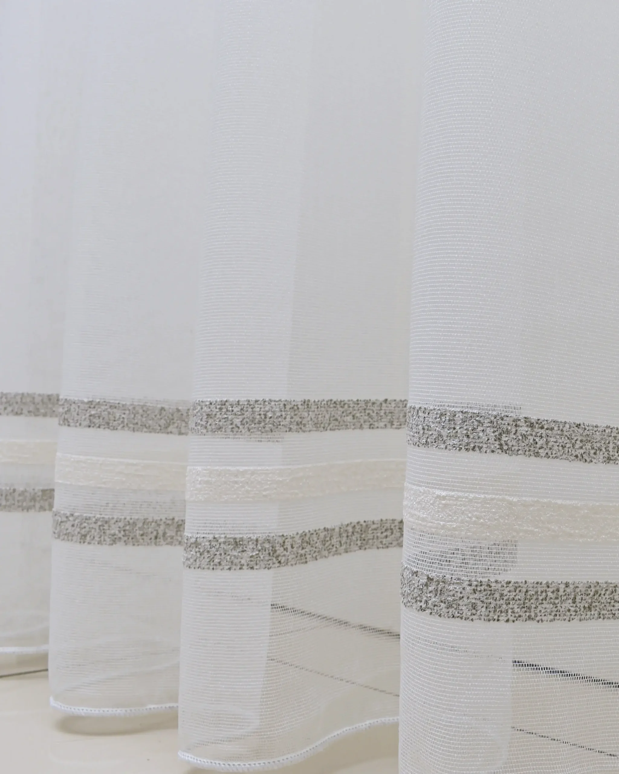 Diskretne sive horizontalne pruge daju ovoj zavesi poseban vizuelni akcenat i sofisticiran izgled, bez narušavanja jednostavnosti prostora. Neutralna kombinacija bele i sive boje čini je idealnim izborom za dnevne sobe, spavaće sobe, trpezarije i poslovne prostore.